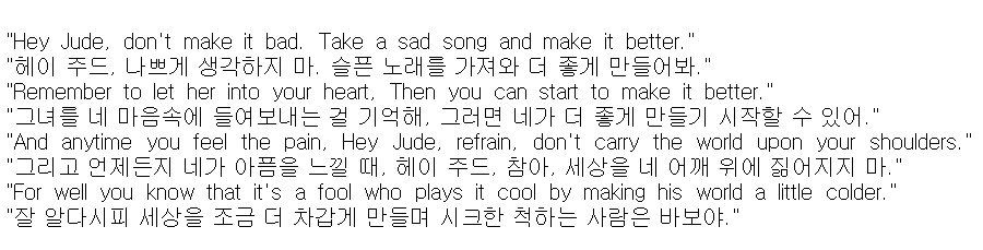 - 영어 발음: 앤드 애니타임 유 필 더 페인, 헤이 주드, 리프레인.